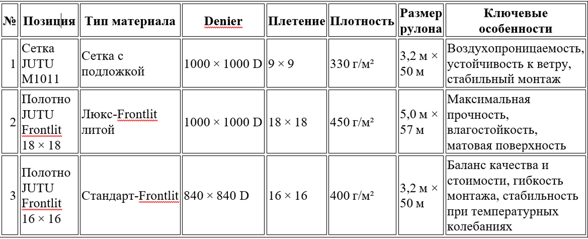 Стоимость: 4,20 BYN за 1 м.кв. Описание: Frontlit‑баннер по литой технологии – полиэфирная сетка полностью пропитана ПВХ, что увеличивает жёсткость и долговечность. Отлично подходит для наружной рекламы с фронтальной подсветкой – бигборды, растяжки, рекламные щиты. Обеспечивает ровную матовую поверхность без бликов даже под ярким искусственным освещением. Гладкая структура снижает накопление пыли и облегчает чистку после длительной эксплуатации. Плотность – 450 г/м² Denier – 1000 × 1000 D (линейная плотность нитей: 9000 м нити весит 1000 г, одинаковая в основе и утке – указывает на хорошую прочность и стабильность формы) Плетение – 18 × 18 нитей/дюйм (количество нитей на дюйм по основе × утку; большая плотность означает более ровную поверхность и стабильность печати) Размер рулона – 5,0 м × 57 м